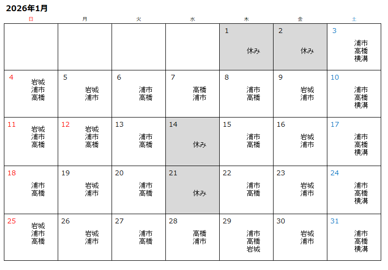 2025.12.30 お知らせ **1月のスタッフ出勤表** 1月のスタッフ出勤表になります! ※12月31~1月2日はお休みになります ※1月14日、1月21日はお休みになります 下にスクロールするとスタッフ紹介が表示されます。