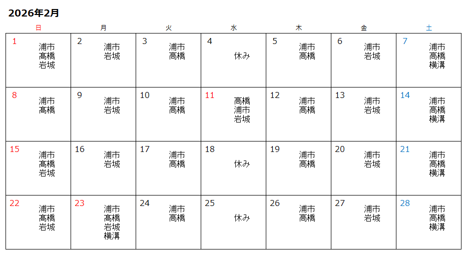 2026.01.20 お知らせ **1・2月のスタッフ出勤表** 1・2月のスタッフ出勤表になります! ※1月21日、2月4日、2月18日、2月25日はお休みになります 下にスクロールするとスタッフ紹介が表示されます。