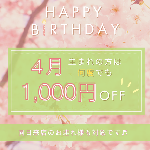 4月生まれの方は今月は何度でも1000円引きにてご利用いただけます♪